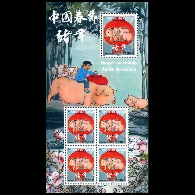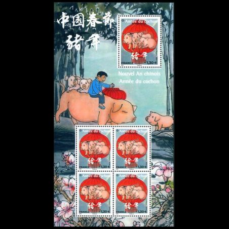 Bloc feuillet de France neuf sans charnière 5 x 1,30 € polychrome Nouvel An chinois. Année du cochon. Dessin humoristique, lanterne, grand et petit format. Le feuillet de 94x175 mm.