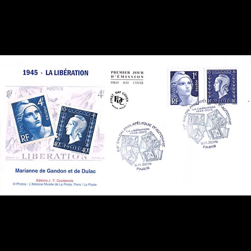 FDC JF - Marianne de Gandon et Dulac. Libération - oblit 5/11/15 Paris - First Day Cover - Enveloppe premier jour de France. Edition Jean Farcigny Dimensions de l'enveloppe : 150 x 90 mm