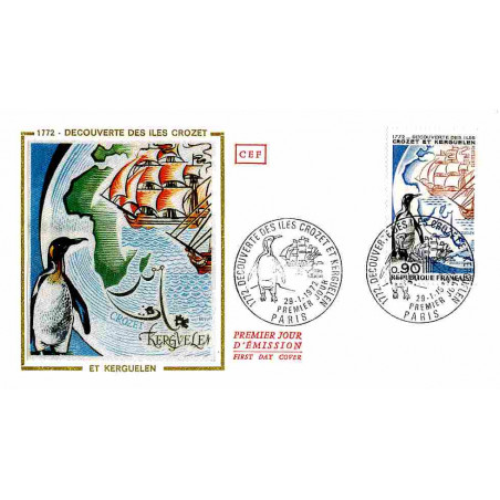 CEF soie - Découverte des Iles Crozet et Kerguelen (1772) - 29/01/1972 Paris - First Day Cover - Enveloppe premier jour de France avec illustration soie.