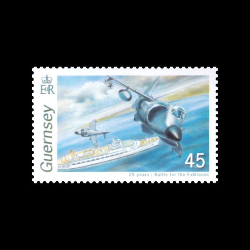 25e anniversaire de la bataille des Malouines. Avions Harrier volant au dessus du navire SS Canberra.