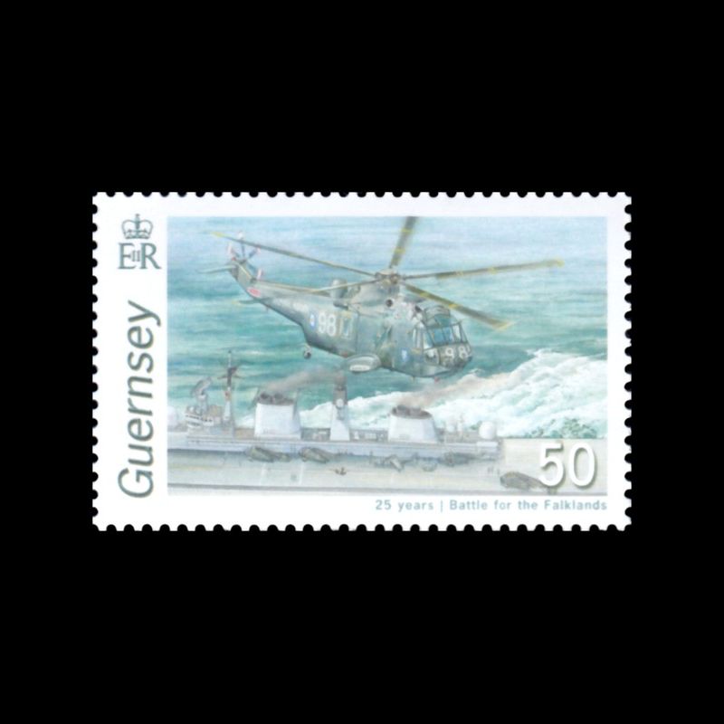 25e anniversaire de la bataille des Malouines. Hélicoptère Sea King évacuant des hommes du navire Sir Galahad en feu.