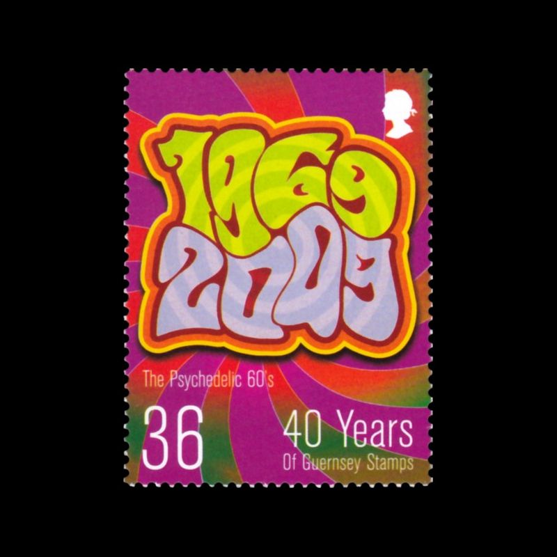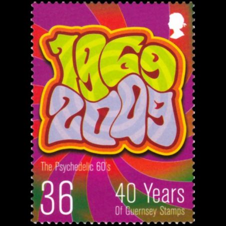 40e anniversaire de l'indépendance postale de Guernesey. Compositions avec "1969-2009 ". Mouvement psychédélique (1960).