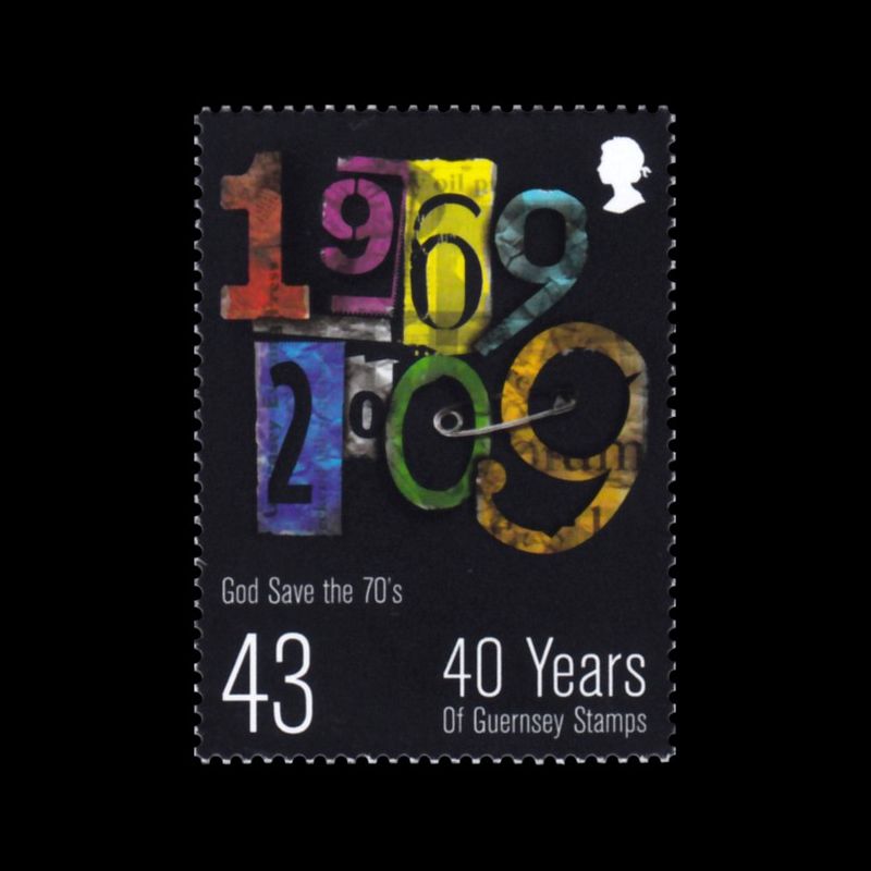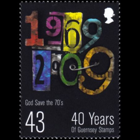 40e anniversaire de l'indépendance postale de Guernesey. Compositions avec "1969-2009 ". " God Save the 70's ".