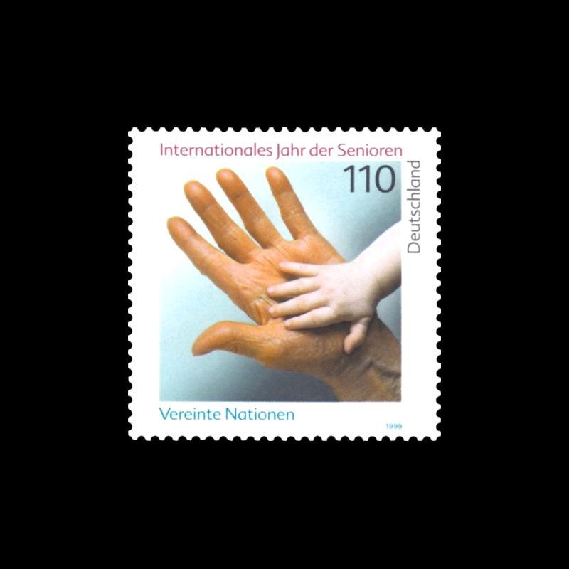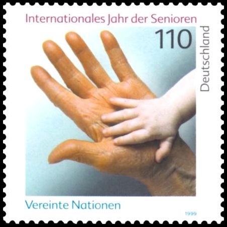 Année internationale des Personnages âgées. Main d'enfant sur une main de vieillard.