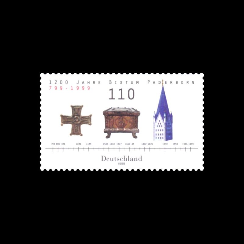 1200° anniversaire de l'Evêché de Paderborn. Fibule cruciforme, autel portable, flèche de la cathédrale.