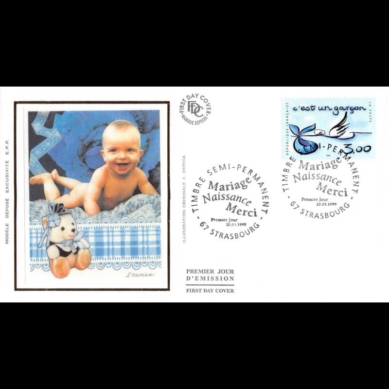 FDC soie - Timbre festif (c'est un garçon) - 20/3/1999 Strasbourg - First Day Cover - Enveloppe premier jour de France avec illustration soie.