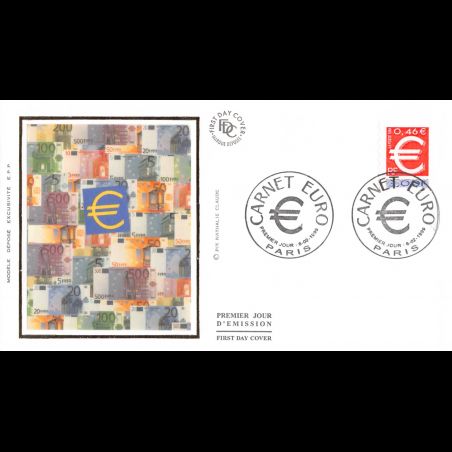 FDC soie - Timbre euro issu de carnet - 1/1/1999 Paris - First Day Cover - Enveloppe premier jour de France avec illustration soie.