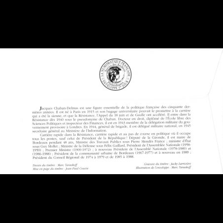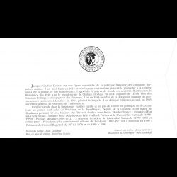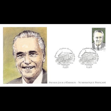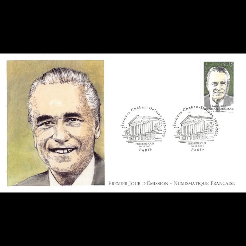 FDC LNF - Jacques Chaban Delmas - 10/11/2001 Paris - First Day Cover - Enveloppe premier jour de France. Edition La Numismatique Française Dimensions de l'enveloppe : 175 x 100 mm