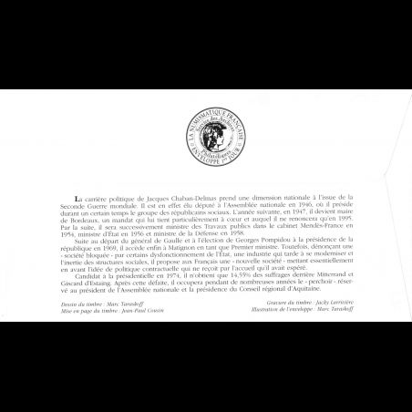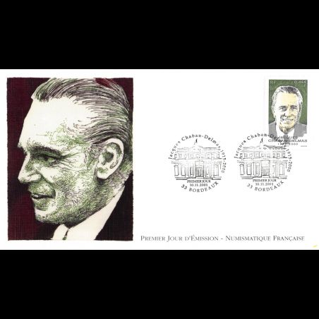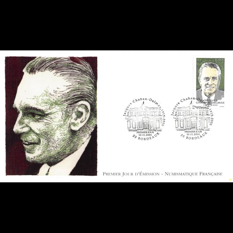 FDC LNF - Jacques Chaban Delmas - 10/11/2001 Bordeaux - First Day Cover - Enveloppe premier jour de France. Edition La Numismatique Française Dimensions de l'enveloppe : 175 x 100 mm