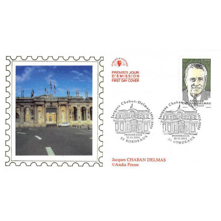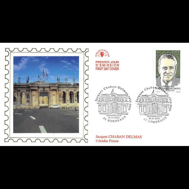 CEF soie - Jacques Chaban Delmas - 10/11/2001 Bordeaux - First Day Cover - Enveloppe premier jour de France avec illustration soie.