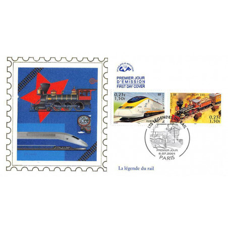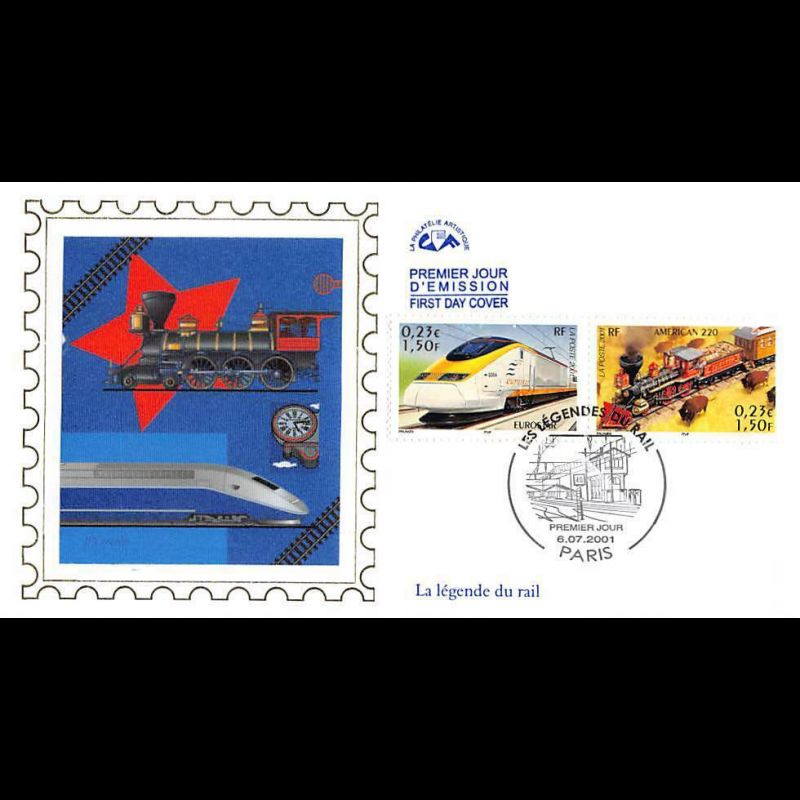 CEF soie - Les légendes du rail, Eurostar et American 220 - 6/7/2001 Paris - First Day Cover - Enveloppe premier jour de France avec illustration soie.