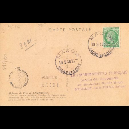 Carte maximum - n° 795 - Personnage célèbre - Alphonse Prat de LAMARTINE